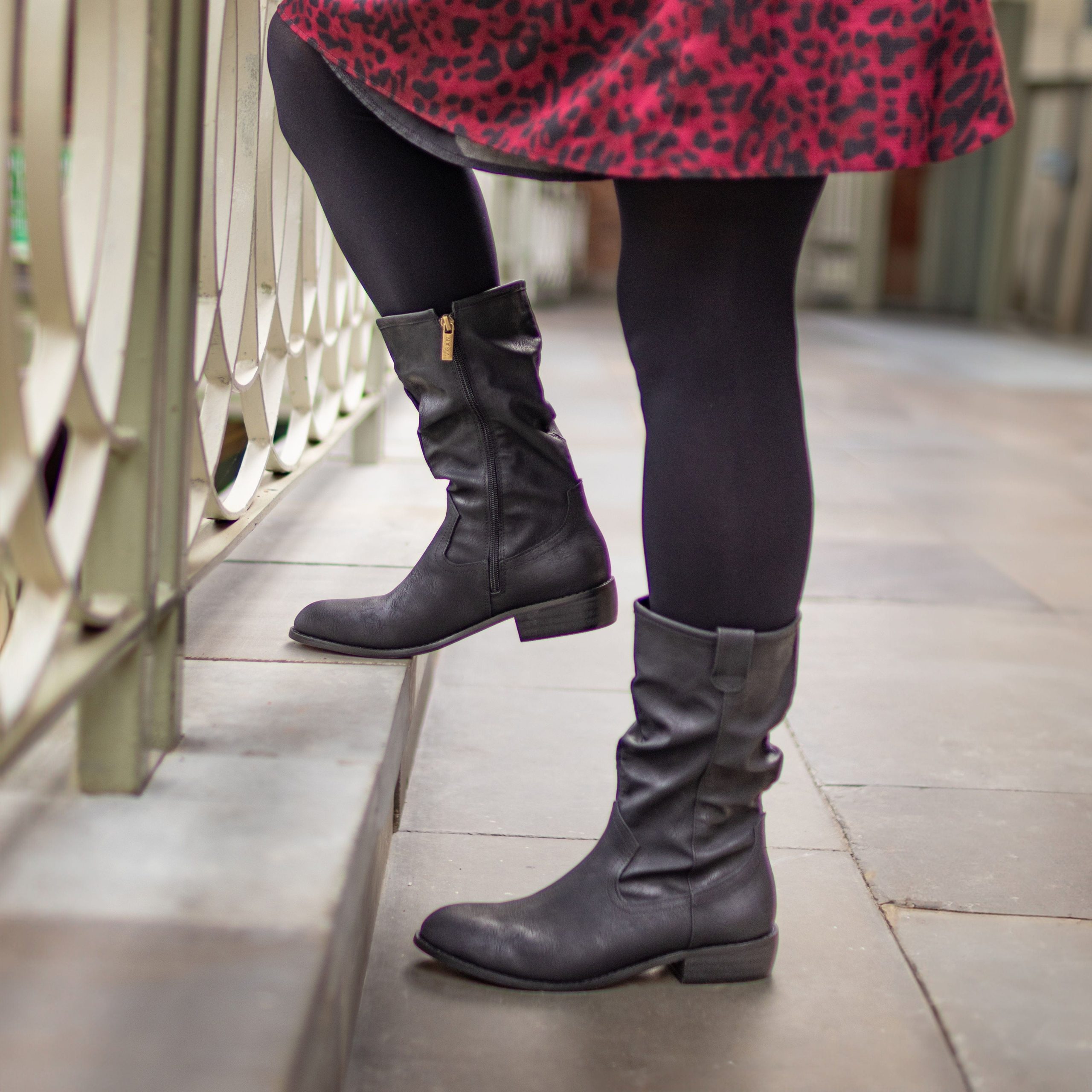Saddle up in style with these rich brown mid-calf boots that prove compassionate fashion never looked so good.